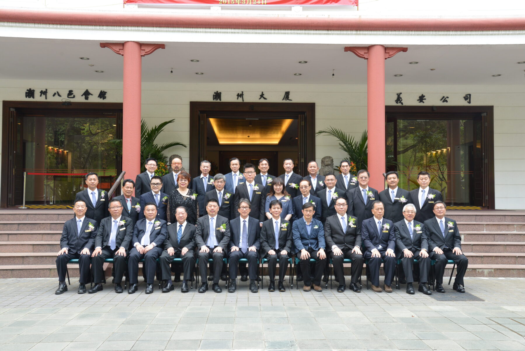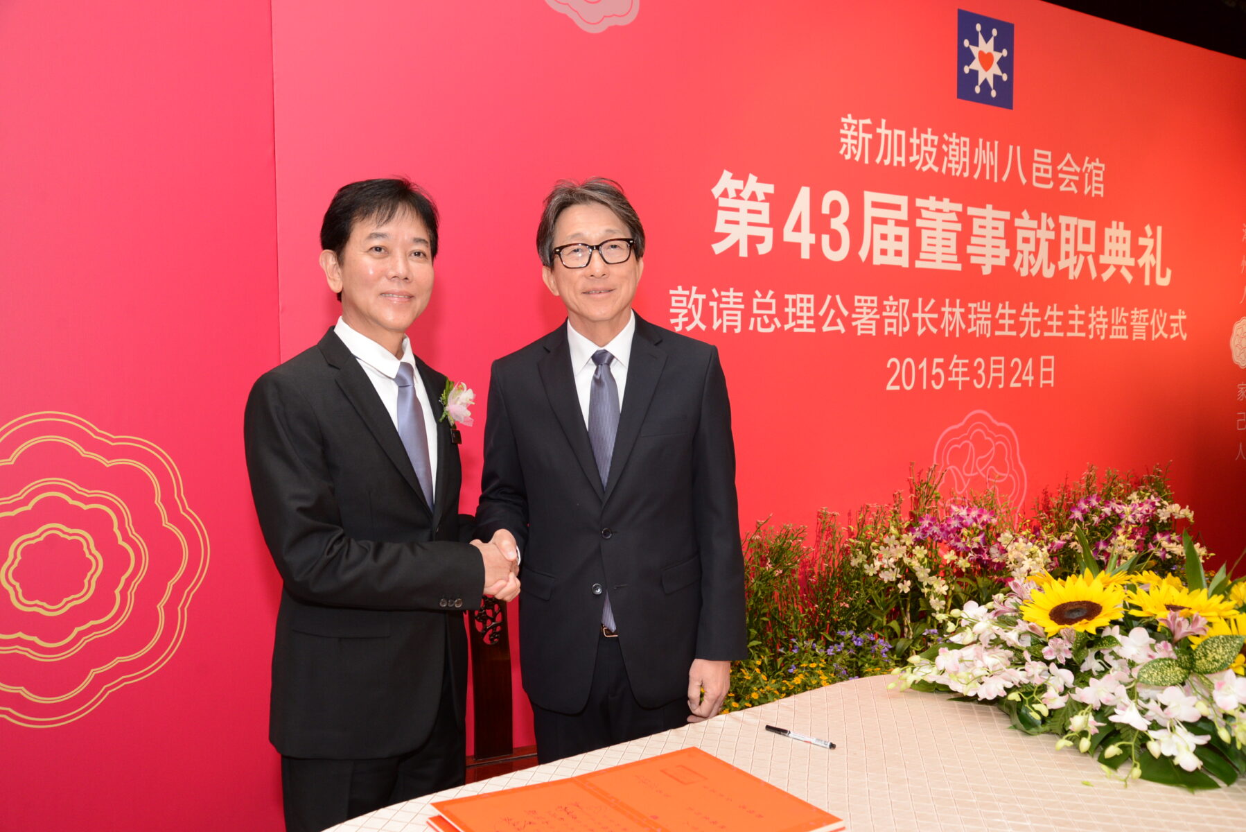 2015 年 3 月 25 日潮州八邑会馆在潮州大厦举办第 43 届董事会就职典礼。总理公署部长林瑞生主持监誓仪式,到场观礼的嘉宾还有贸工部政务部长张思乐、宏茂桥集选区议员成汉通、義安公司总理林继民、潮州八邑会馆永远名誉会长翁烈强及義安公司副总理兼潮州总会副会长陈健立等,近 200 人出席就职典礼。就职典礼前,全体起立为建国总理李光耀的逝世默哀一分钟,表示深切的哀悼。